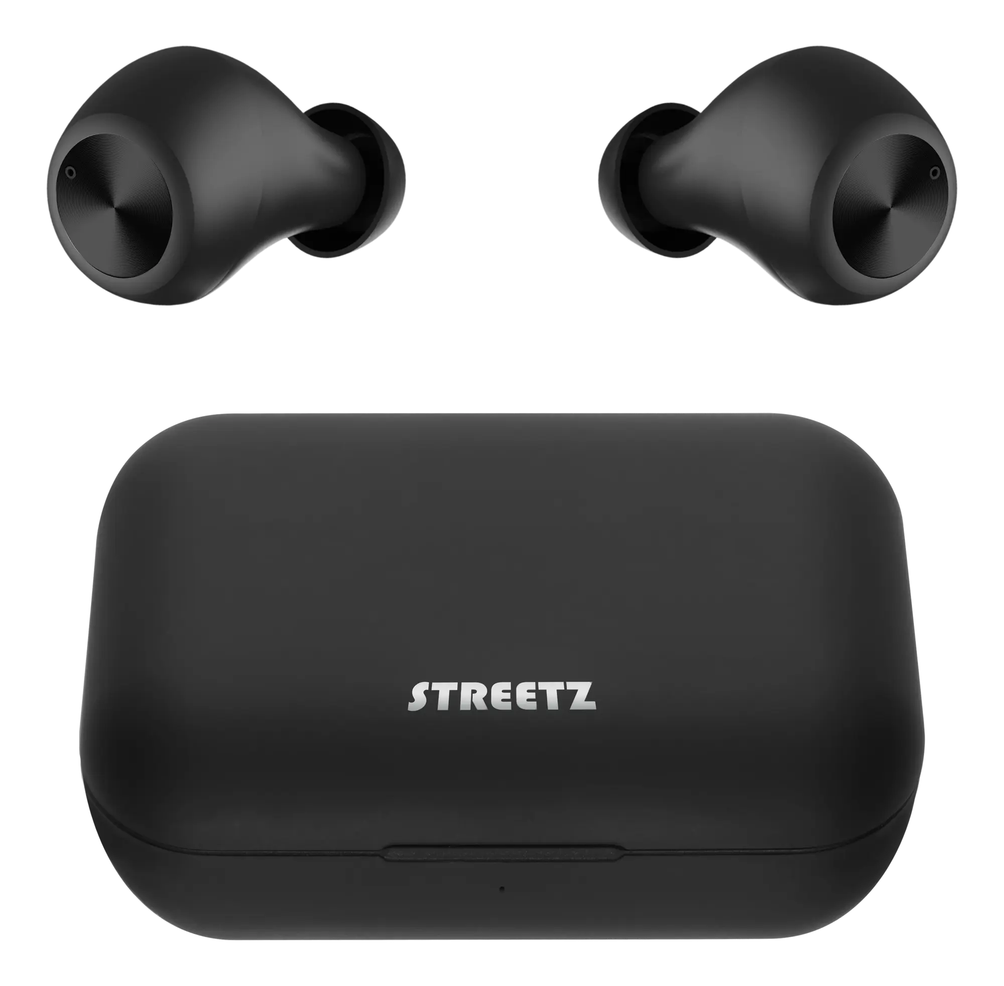 Trådløse TWS-hovedtelefoner fra STREETZ med mikrofon, opkalds-/medieknapper, Bluetooth 5 med 10 m rækkevidde og en ergonomisk pasform for behagelig lytning i op til 16 timer med det medfølgende opladningsetui i sort