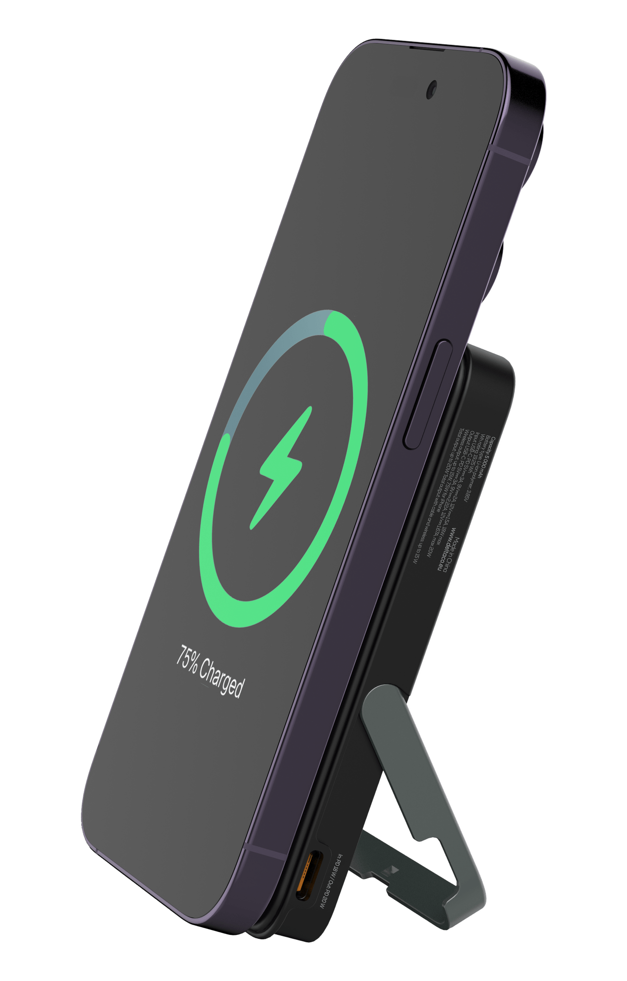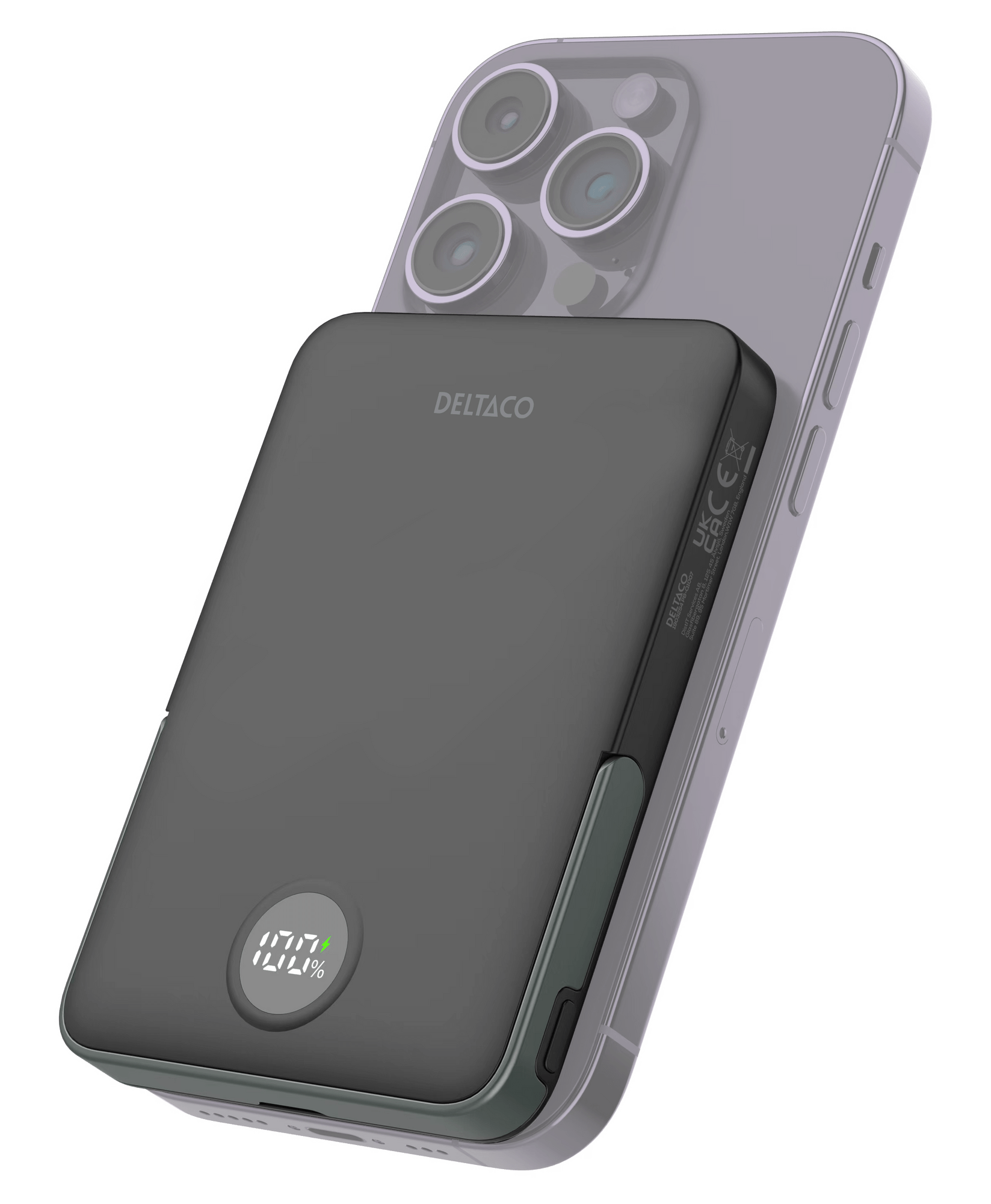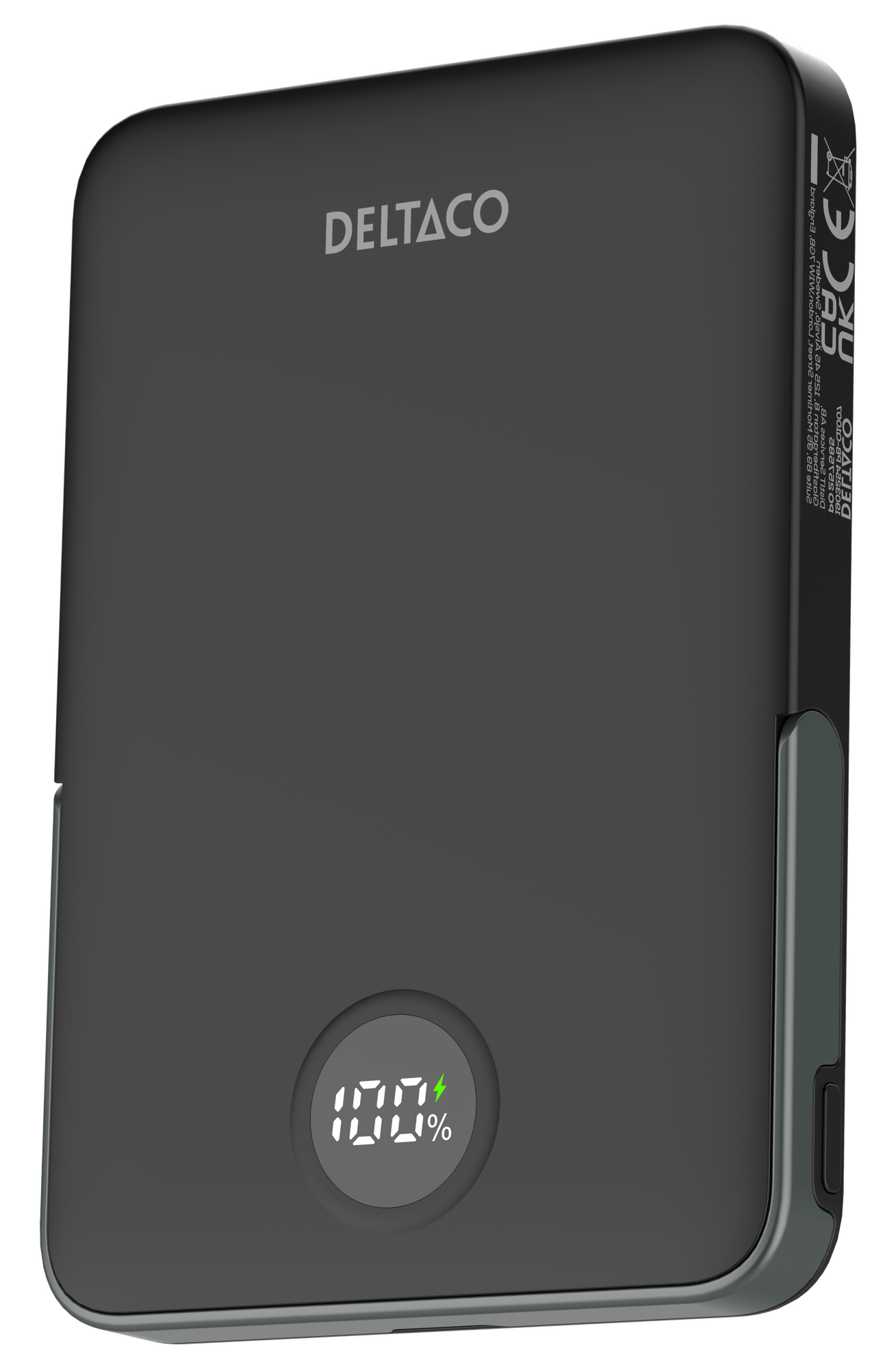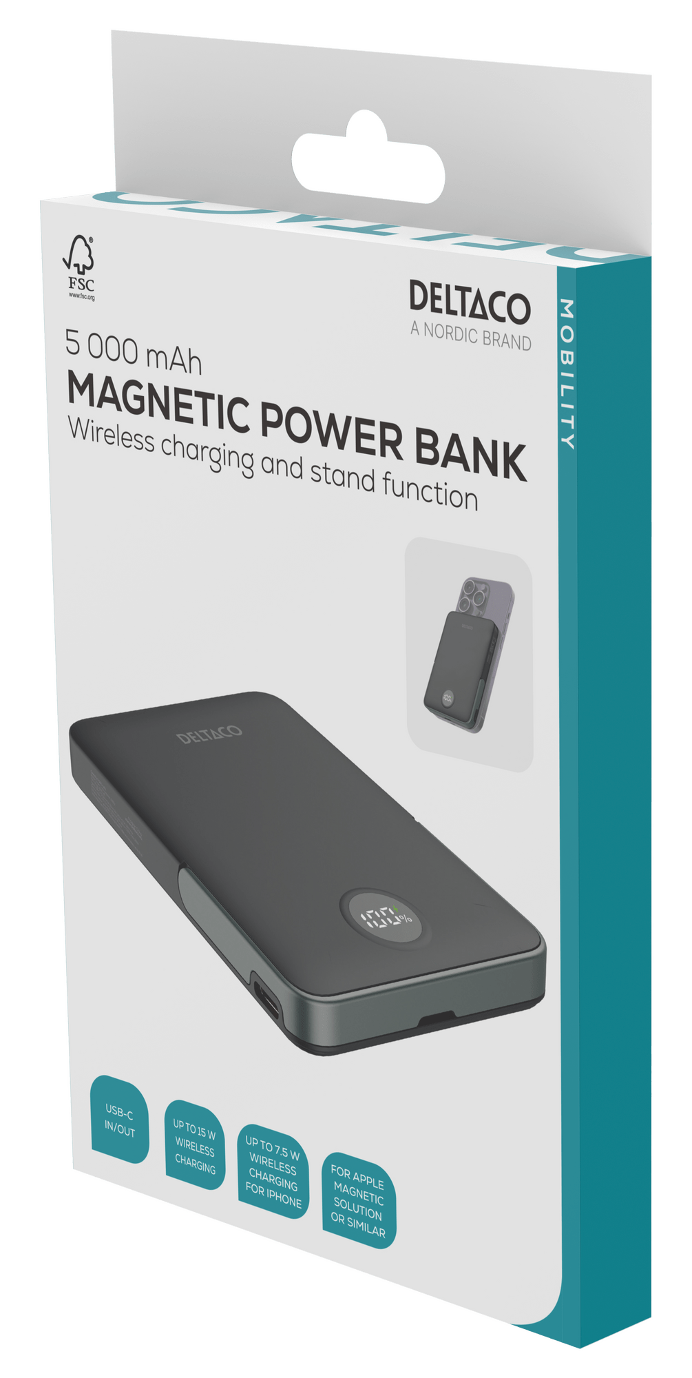 Deltaco Powerbank 5000 mAh, stander, trådløs, PD 20 W, magnet, sort, 5000 mAh, Lithium polymer (LiPo), Trådløs opladning, 20 W, Sort
