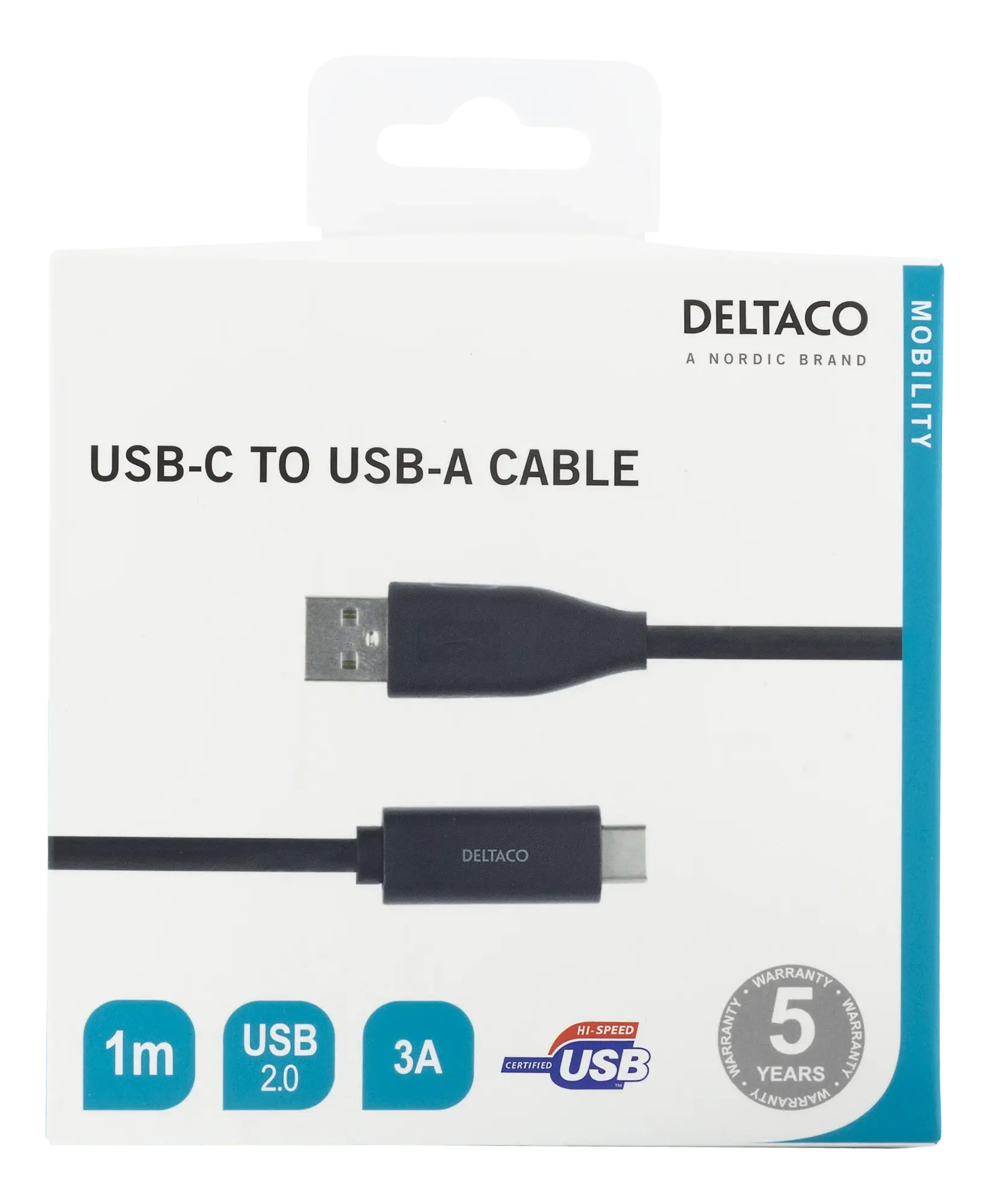 Deltaco USB-C to USB-A Cable, 3A, 1m, Black